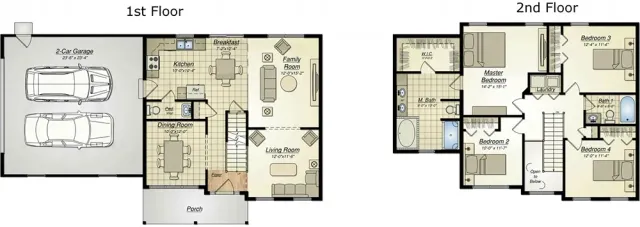 Floor plan of a two-story home, showing a first-floor living area with a garage and a second-floor with four bedrooms.