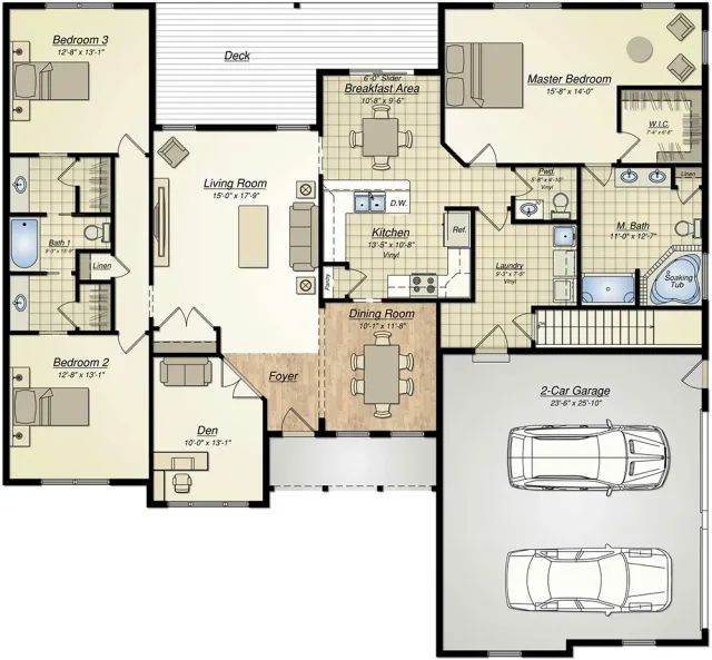 Floor plan of a single-story home with a central living room, three bedrooms, two bathrooms, kitchen, dining, and garage.