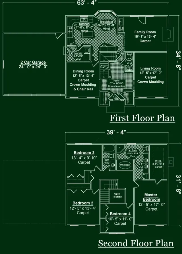 Floor plans for a two-story house showing room layouts and dimensions on a green background.