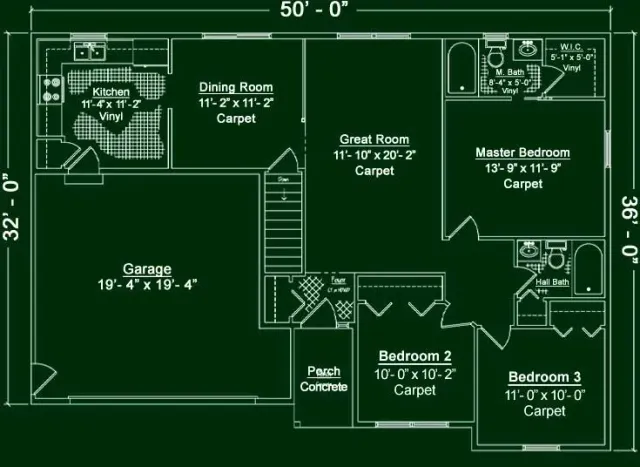 A black and white floor plan of a house, showing a garage, three bedrooms, two bathrooms, a kitchen, and a great room.