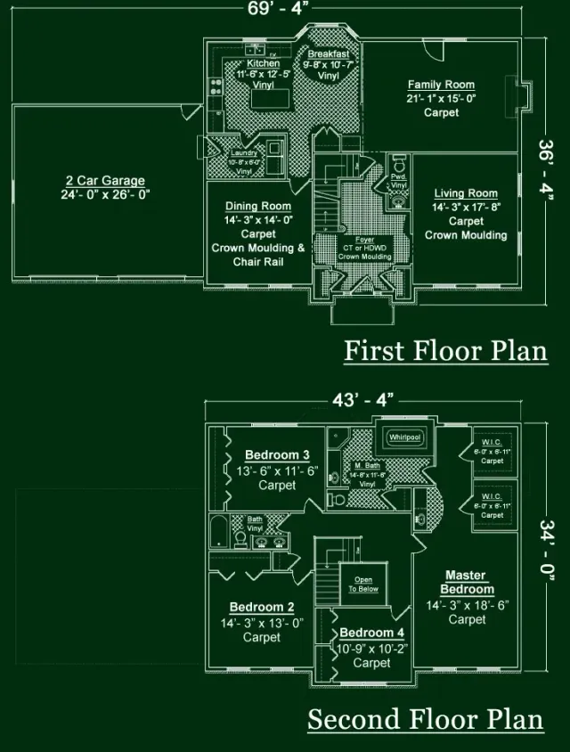 Floor plans for the first and second stories of a house, detailing room names, dimensions, and layout on a dark background.