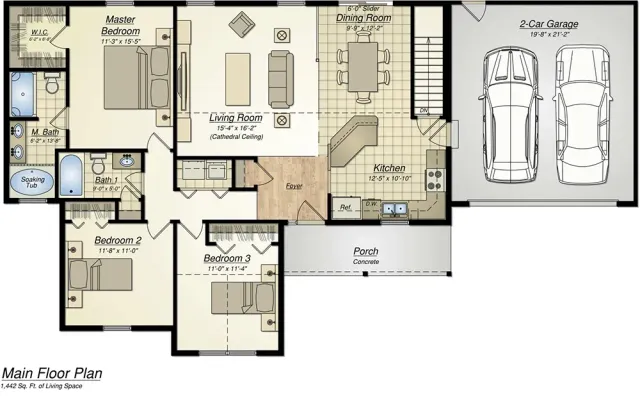 Floor plan of a single-story residential home featuring three bedrooms, two bathrooms, a living area, kitchen, and garage.